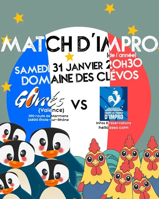 Samedi 31 janvier à 20h30, l’association les Givrés fête ses 20 ans et pour l’occasion, invitent l’équipe de France de théatre d’impro au Domaine des Clévos.